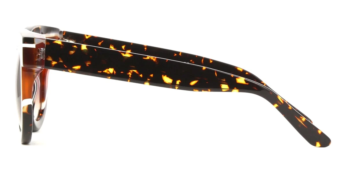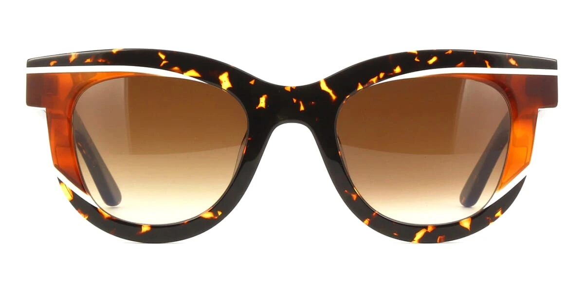 This wayfarer Thierry Lasry sunglass comes in a shiny tortoise with havana and white stripes frame with brown gradient lenses.