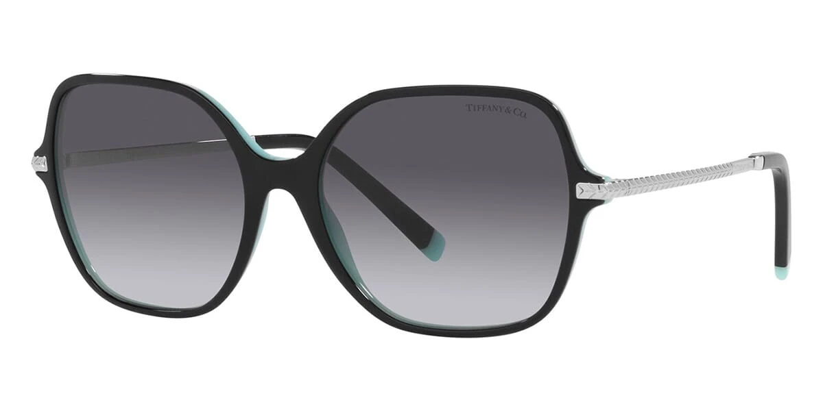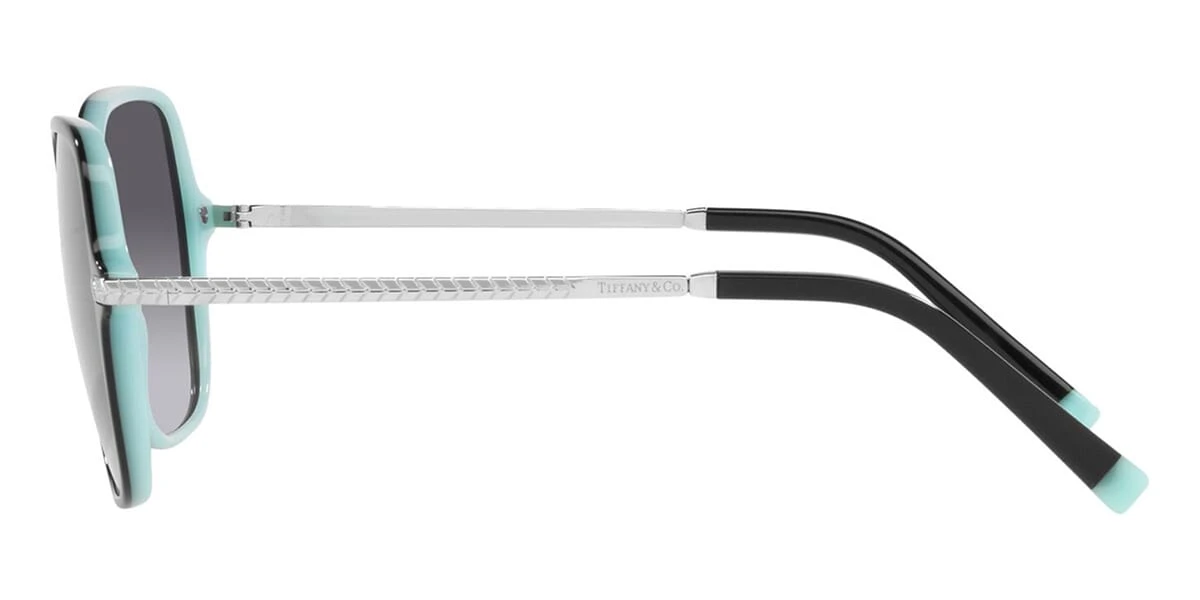 This square Tiffany sunglass comes in a black on tiffany blue frame with grey gradient lenses.