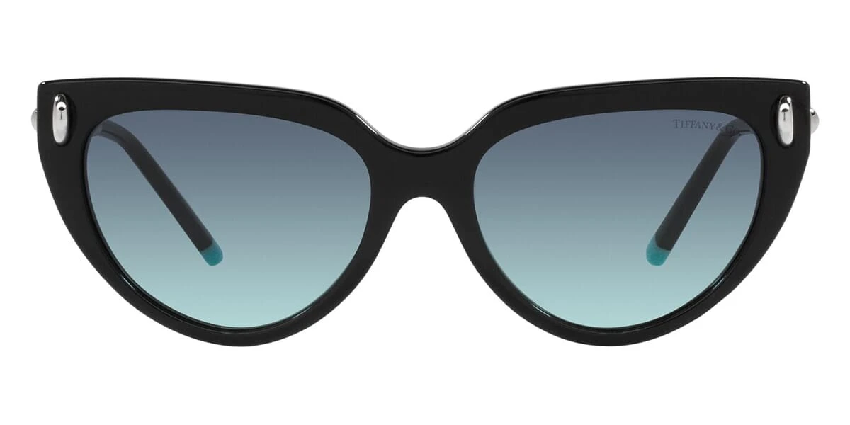 This cat eye Tiffany sunglass comes in a black frame with azure to blue gradient lenses.