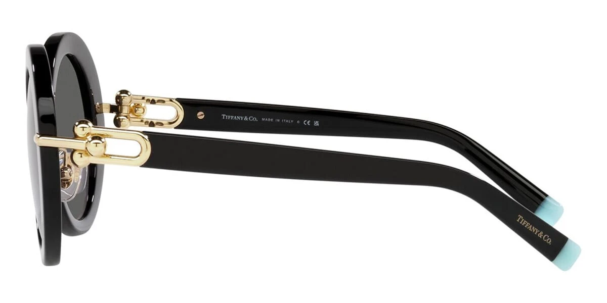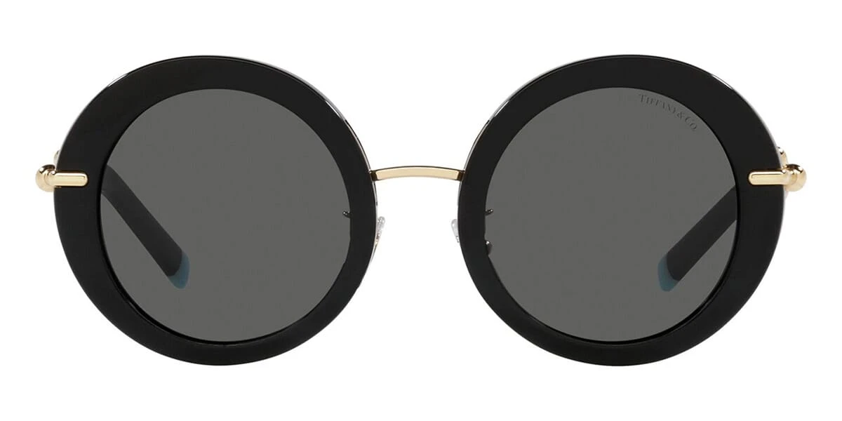 This round Tiffany sunglass comes in a black frame with dark grey lenses.