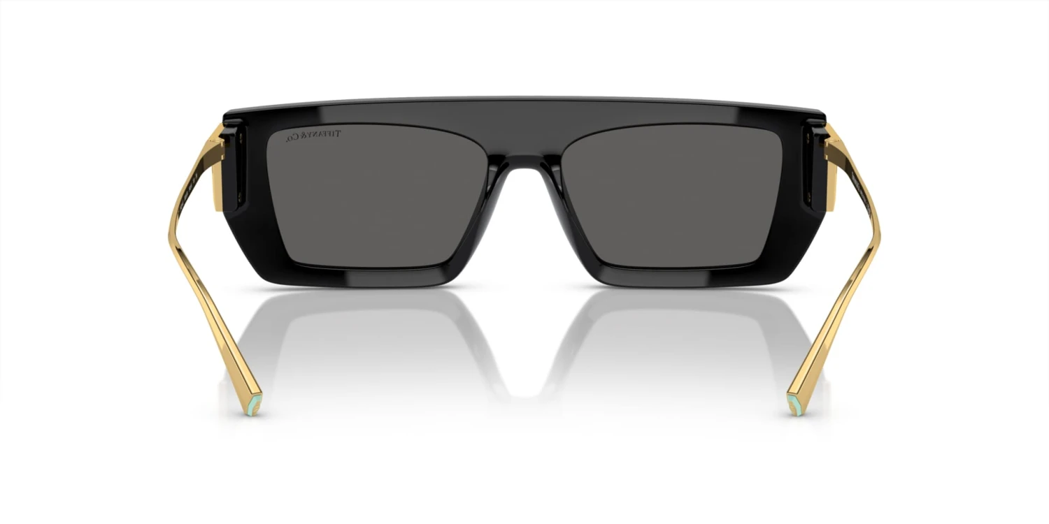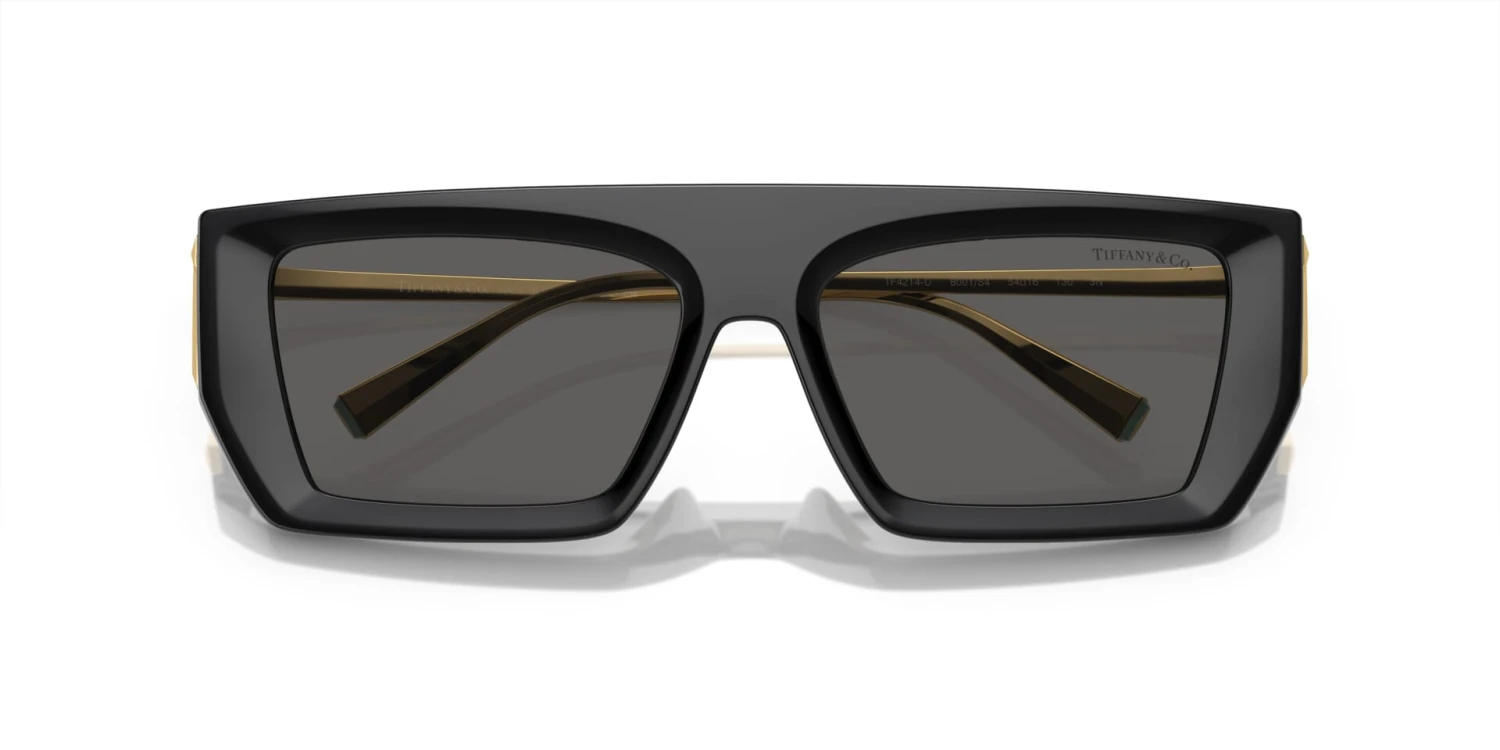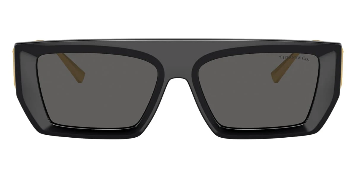 This rectangular Tiffany sunglass comes in a black with gold frame with dark grey lenses.