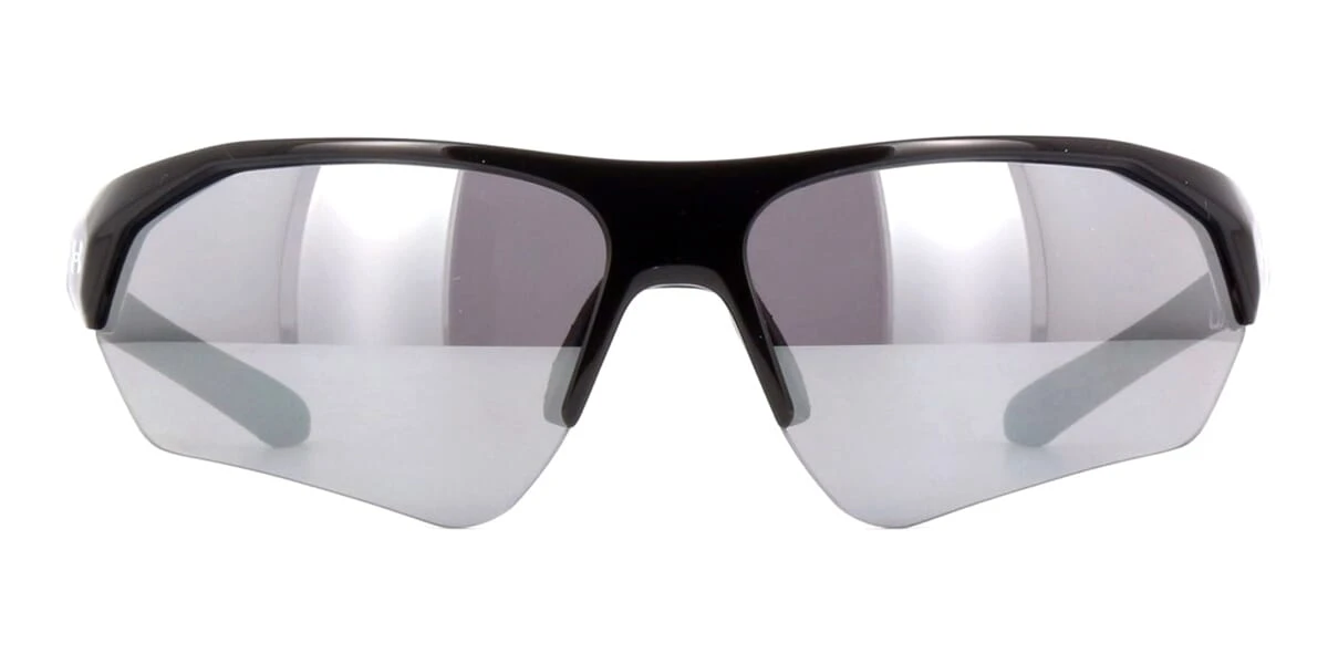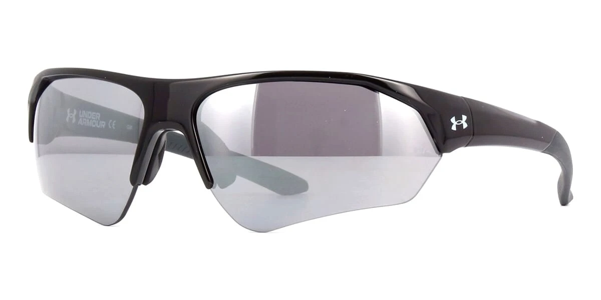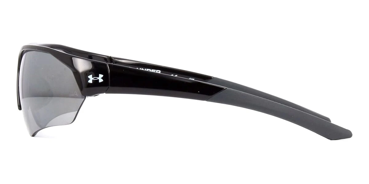 This wraparound Under Armour sunglass comes in a shiny black frame with grey mirrored lenses.