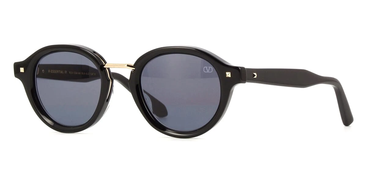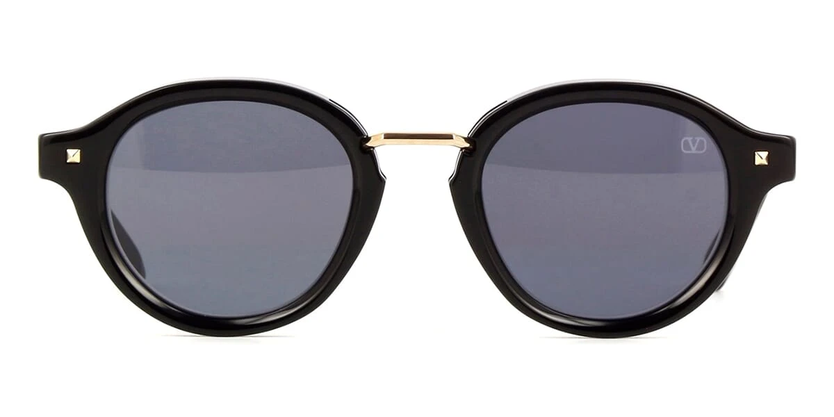 This round Valentino sunglass comes in a shiny black and silver frame with grey with light mirror lenses.