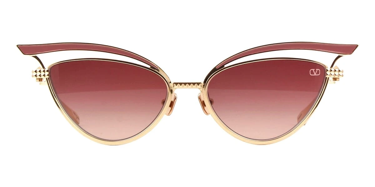 This cat eye Valentino sunglass comes in a white gold with powder enamel frame with dark rose to light rose gradient lenses.
