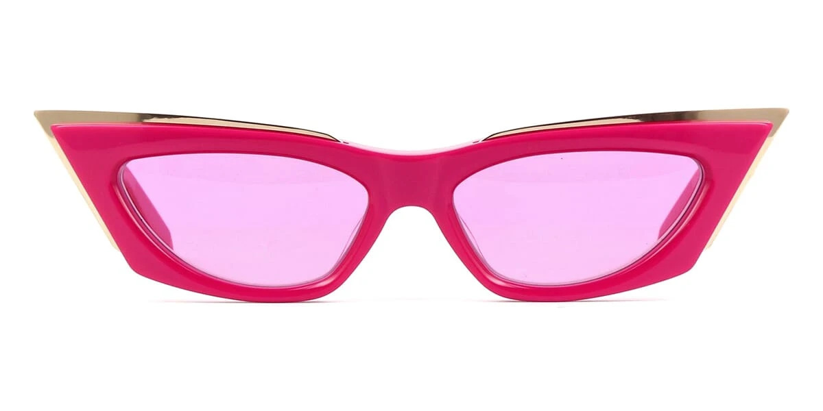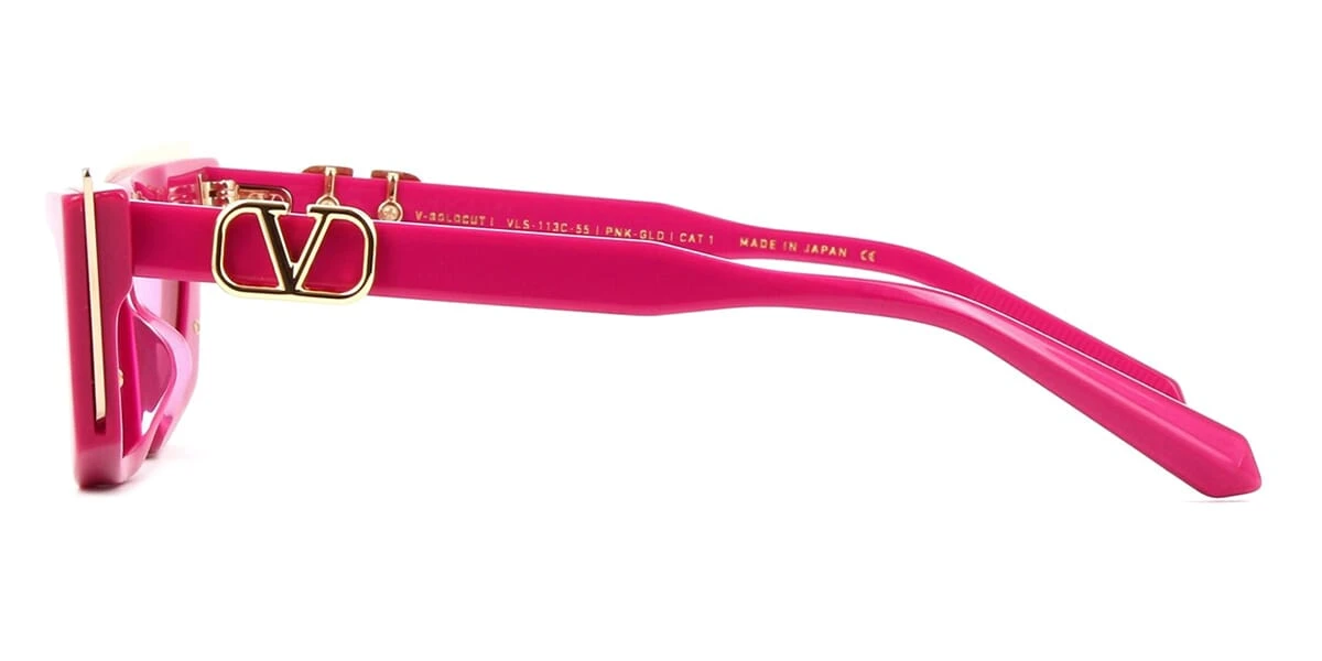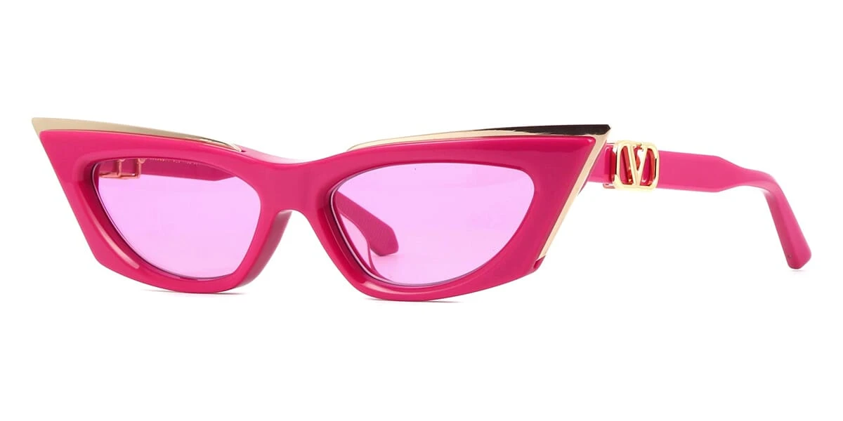 This cat eye Valentino sunglass comes in a shiny pink with gold frame with shiny light pink lenses.