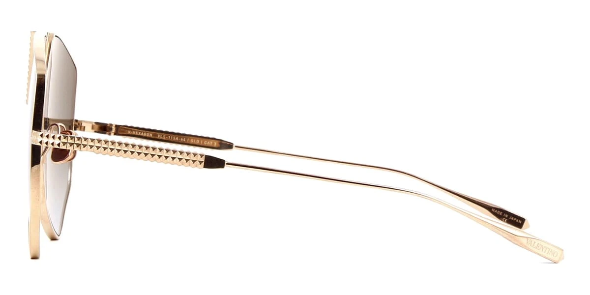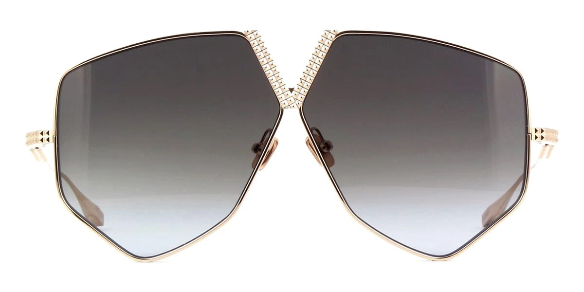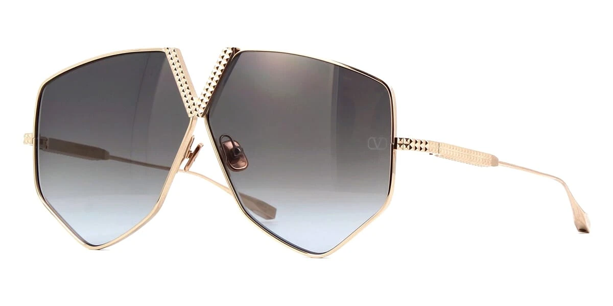 This aviator Valentino sunglass comes in a shiny gold frame with grey gradient lenses.
