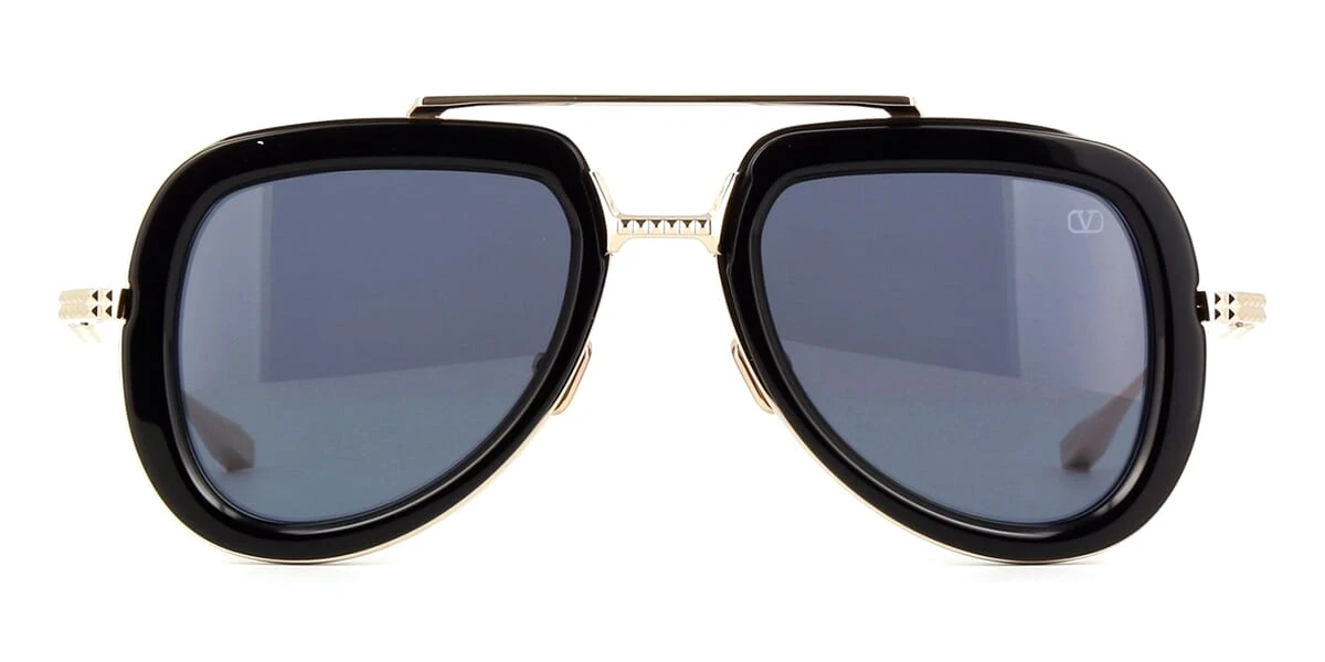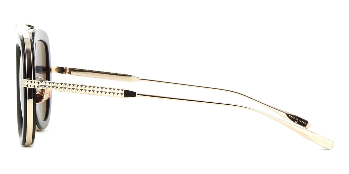 This aviator Valentino sunglass comes in a shiny black and gold frame with grey with light mirror lenses.