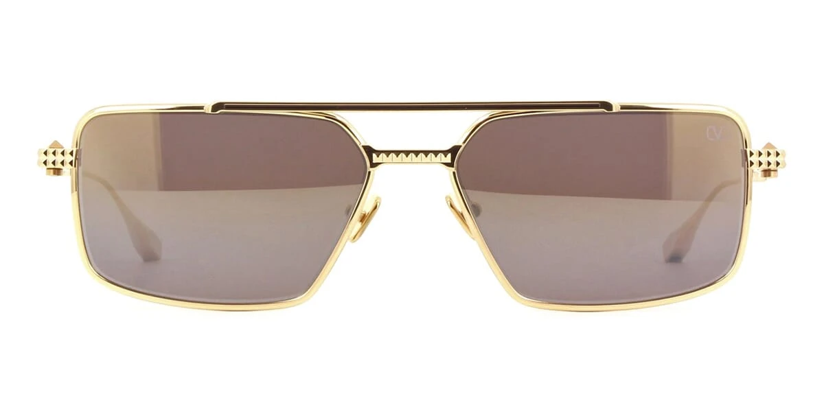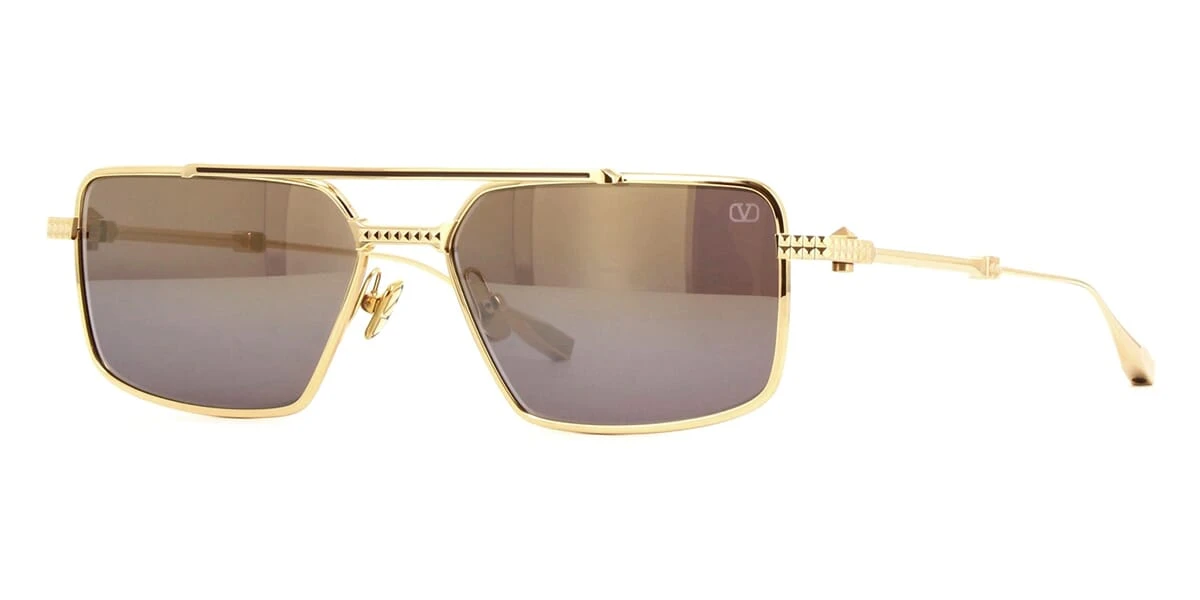 This square Valentino sunglass comes in a light gold titanium frame with brown with gold to silver gradient flash mirror lenses.