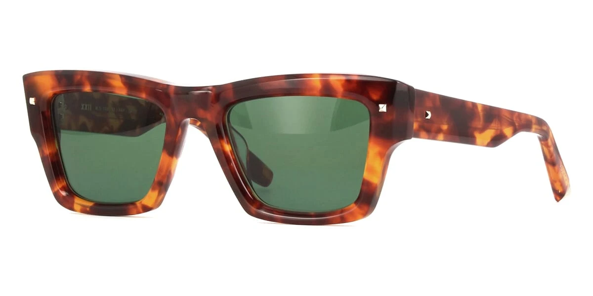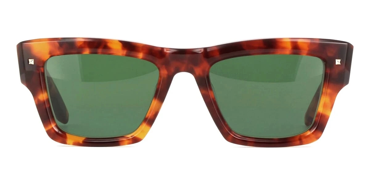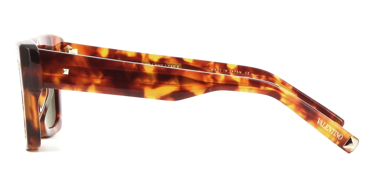 This square Valentino sunglass comes in a sculptured honey tortoise frame with dark green lenses.