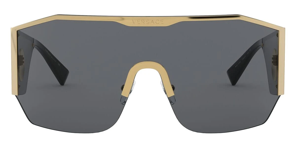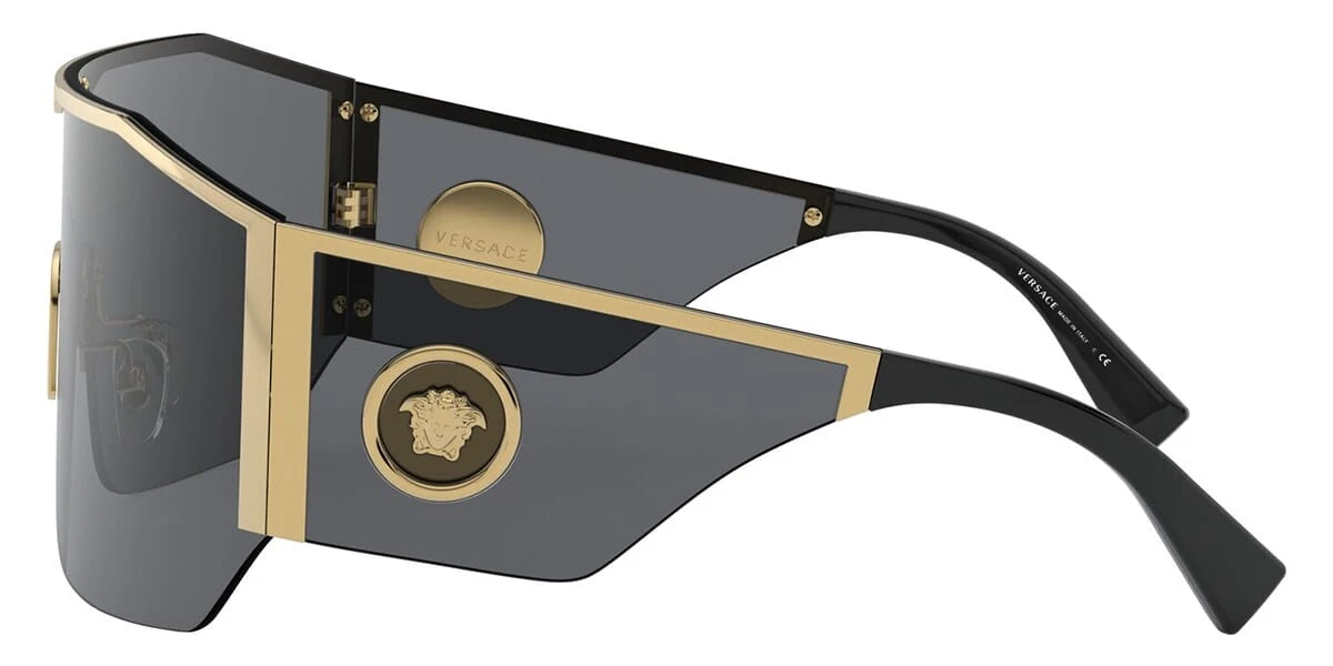 This shield Versace sunglass comes in a gold frame with dark grey lenses.