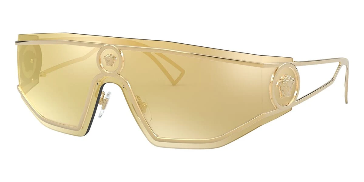 This shield Versace sunglass comes in a gold frame with brown with gold mirror lenses.
