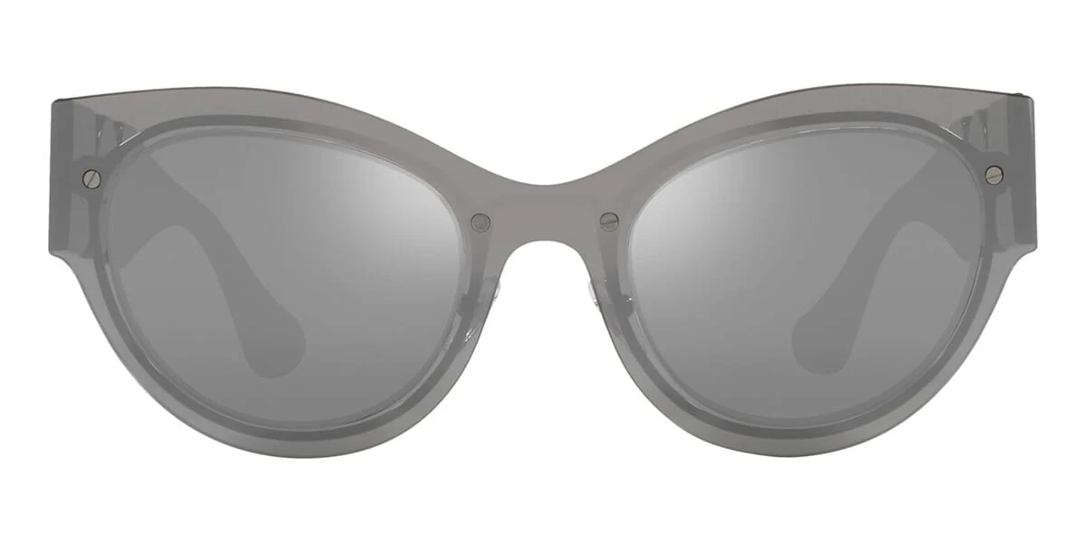 This cat eye Versace sunglass comes in a grey crystal with silver mirror frame with light grey with silver mirror lenses.