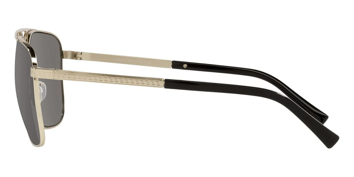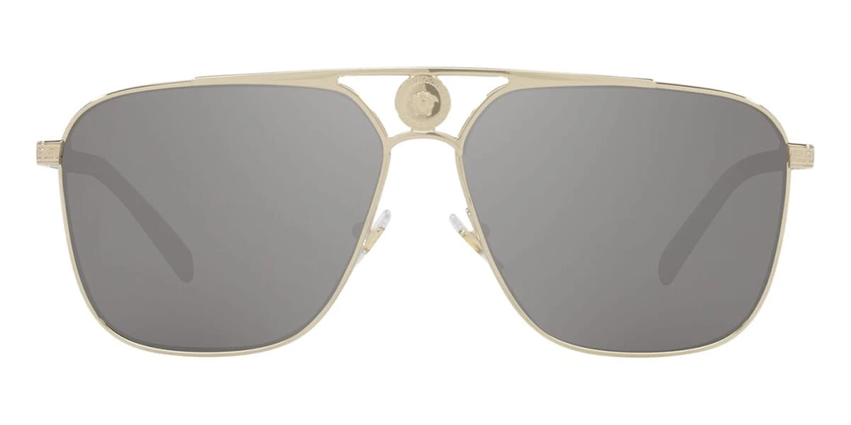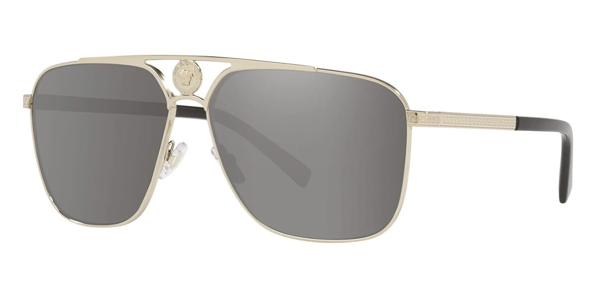 This rectangular Versace sunglass comes in a pale gold frame with light grey with silver mirror lenses.
