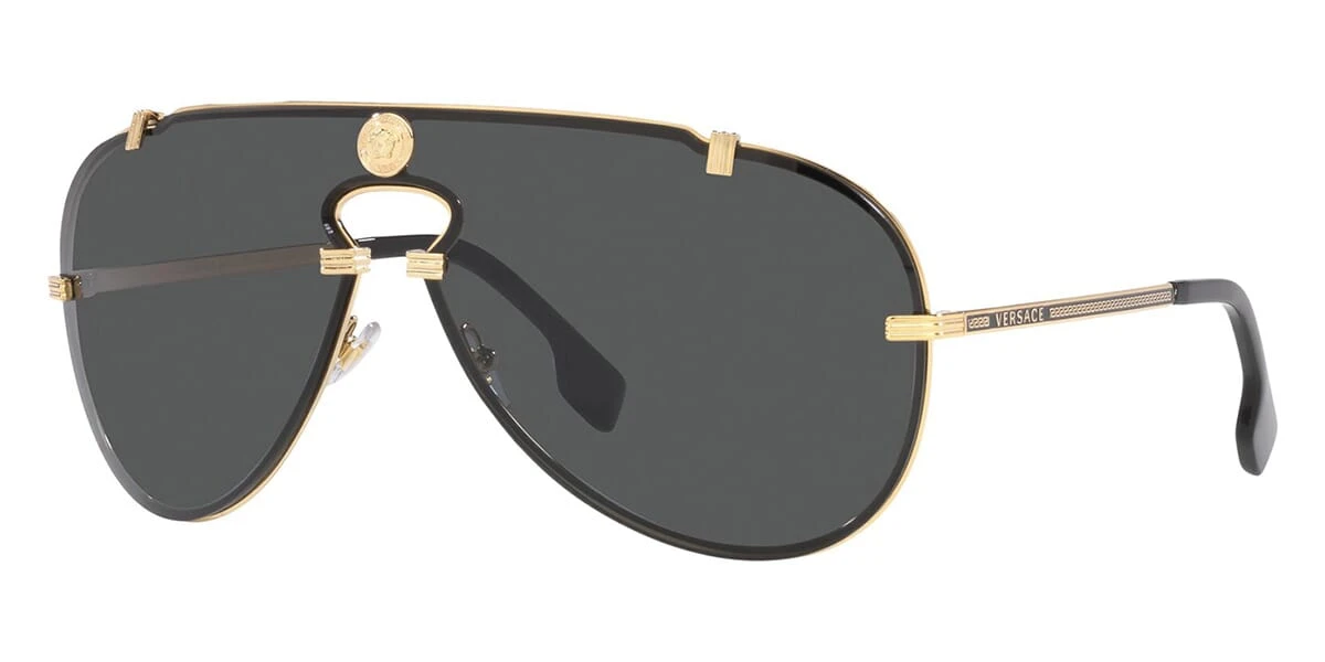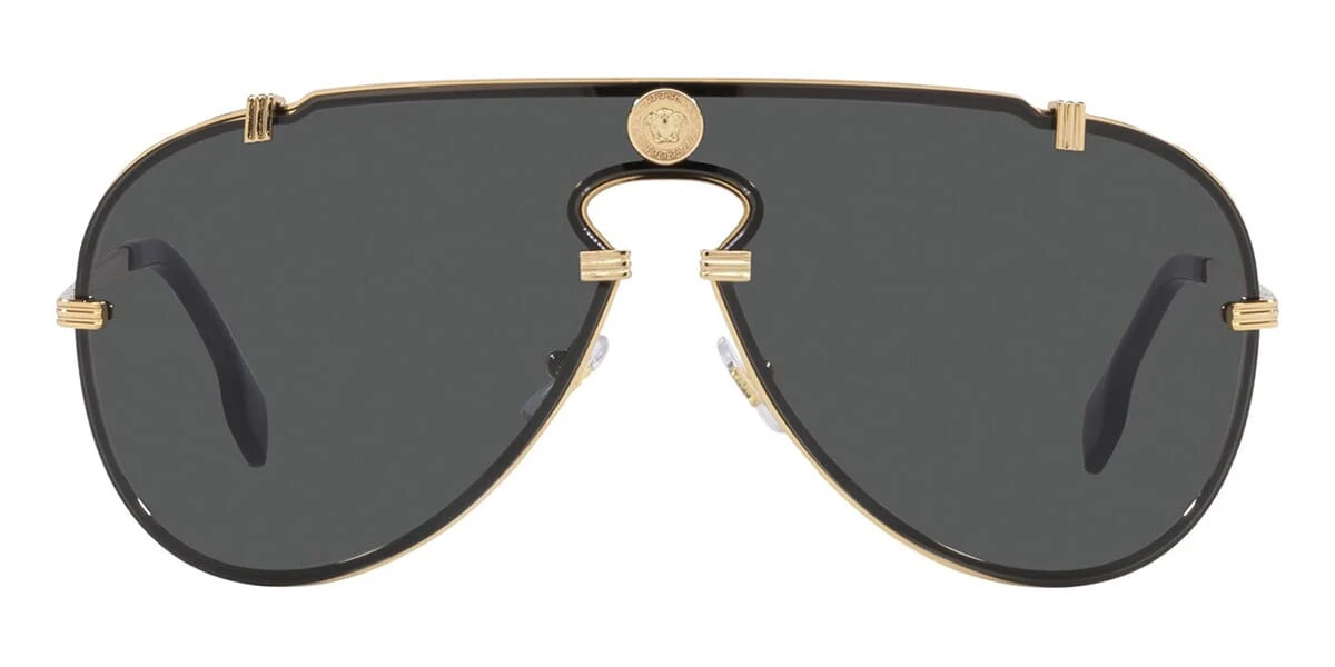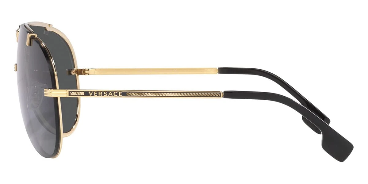 This aviator Versace sunglass comes in a gold frame with dark grey lenses.