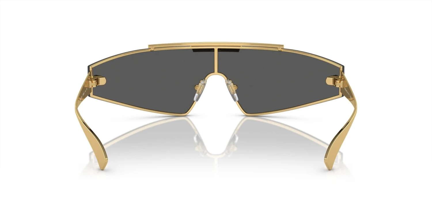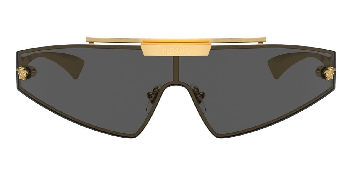 This shield Versace sunglass comes in a gold frame with dark grey with gold mirror lenses.