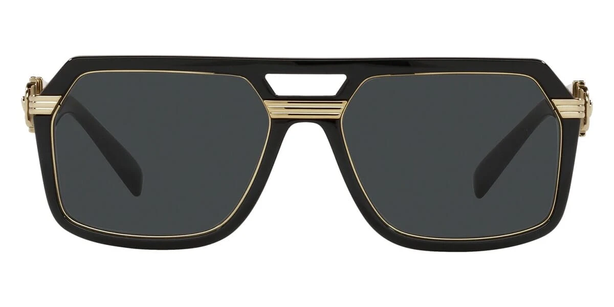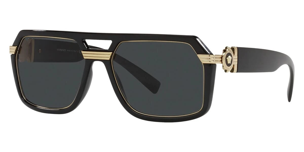This square Versace sunglass comes in a black frame with dark grey lenses.
