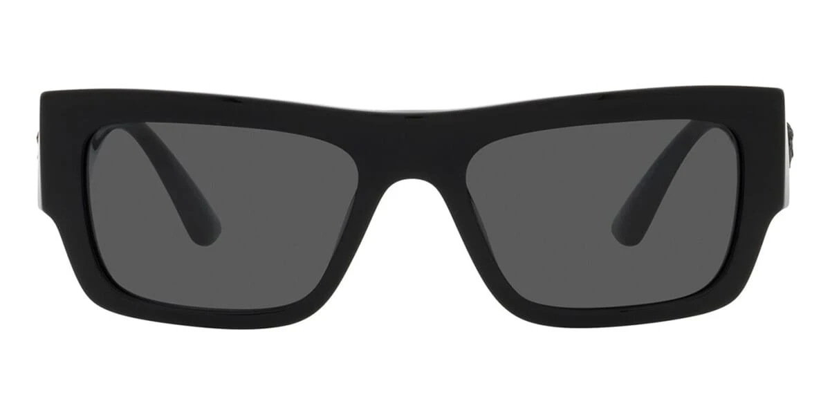 This rectangular Versace sunglass comes in a black frame with dark grey lenses.