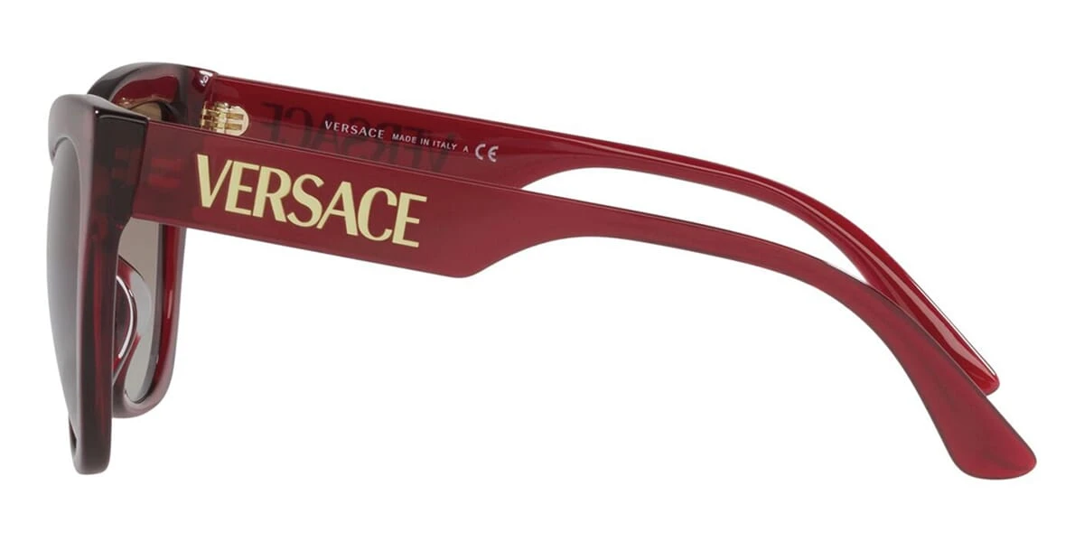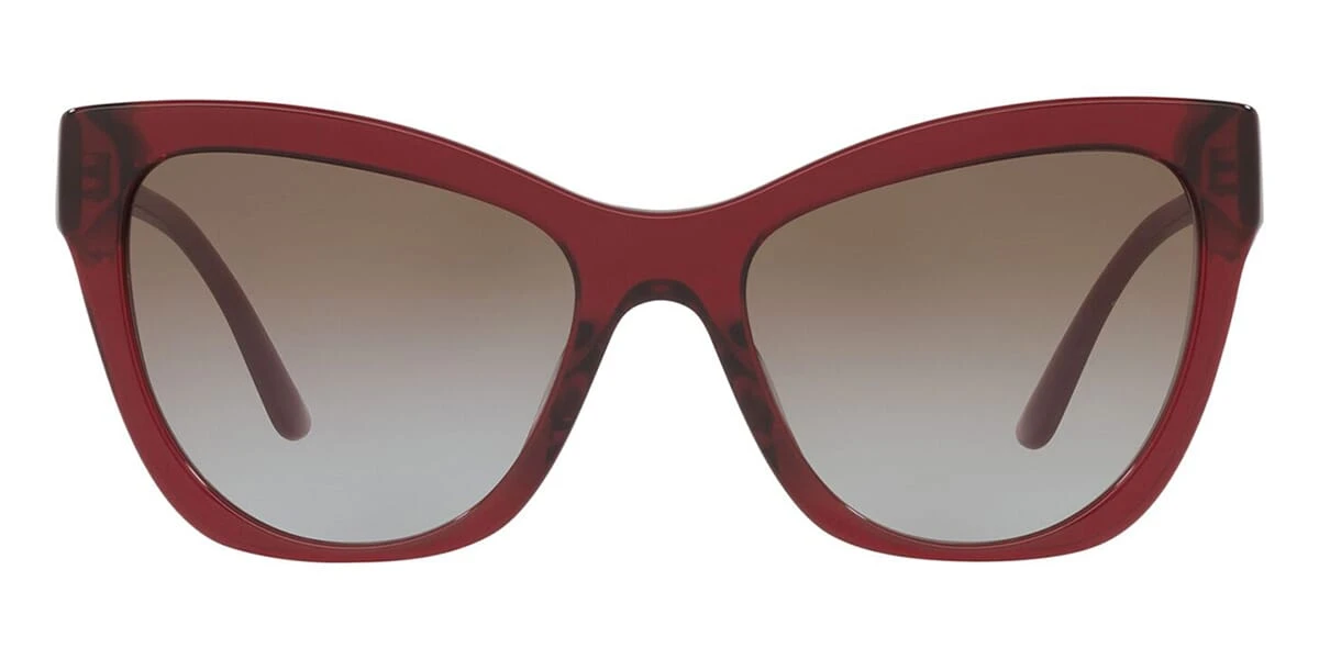 This cat eye Versace sunglass comes in a red crystal frame with grey to brown gradient lenses.