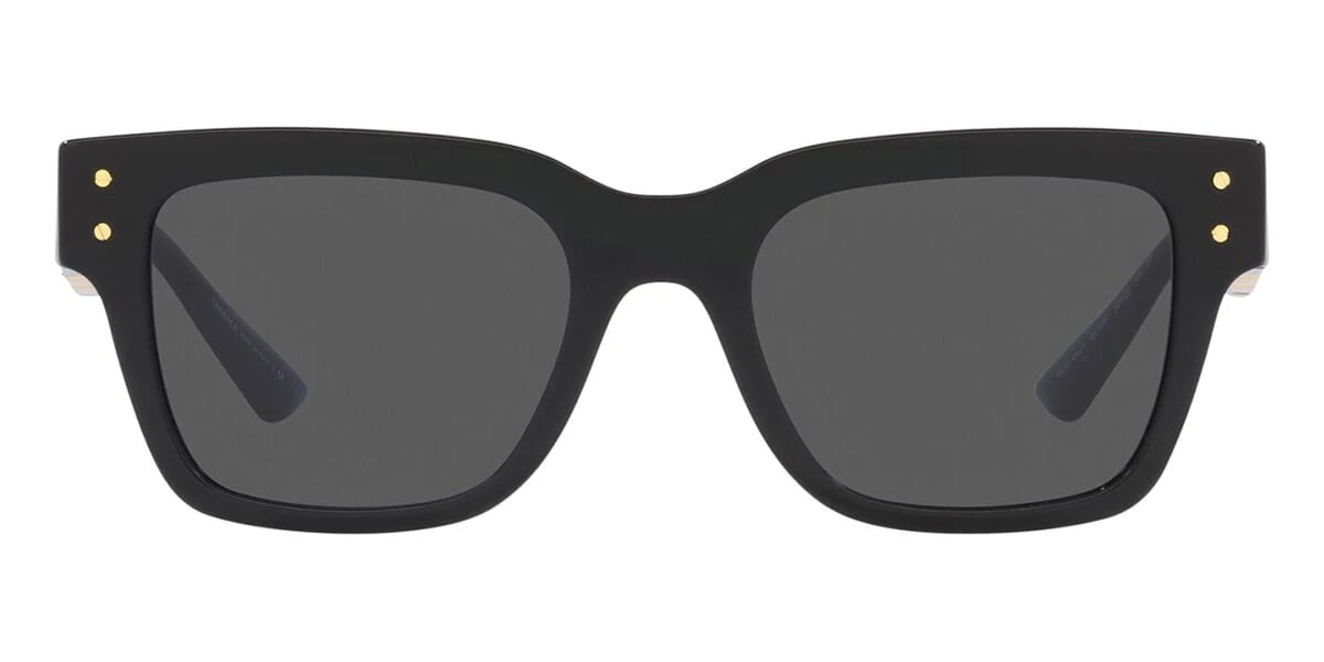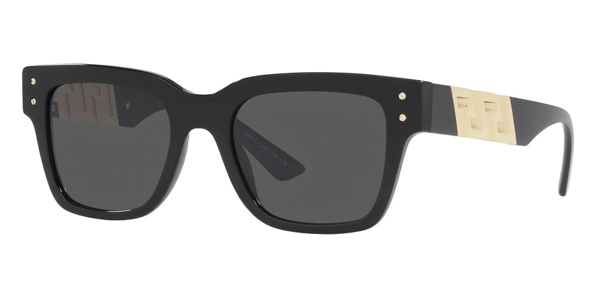 This rectangular Versace sunglass comes in a black frame with dark grey lenses.