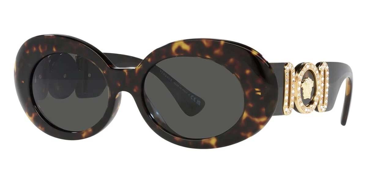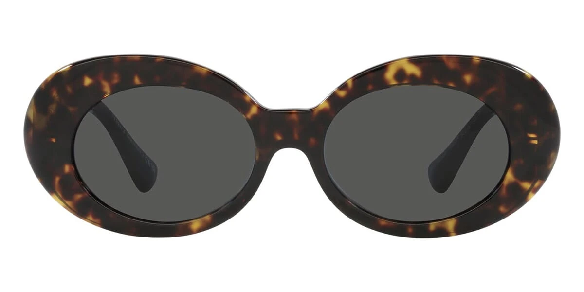 This round Versace sunglass comes in a havana frame with dark grey lenses.