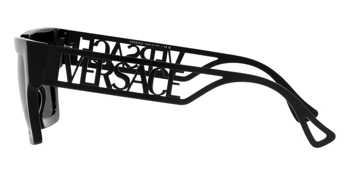 This square Versace sunglass comes in a black frame with dark grey lenses.