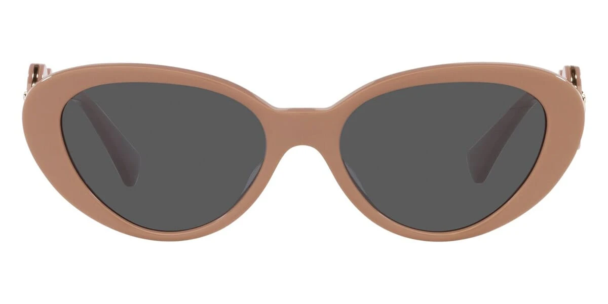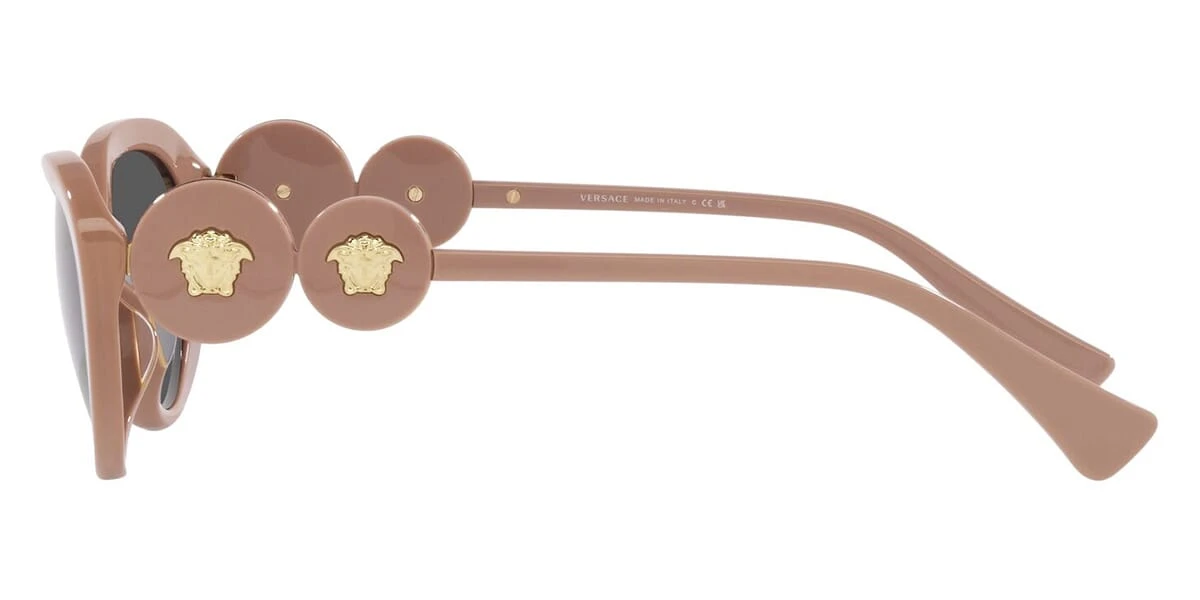 This cat eye Versace sunglass comes in a beige frame with dark grey lenses.