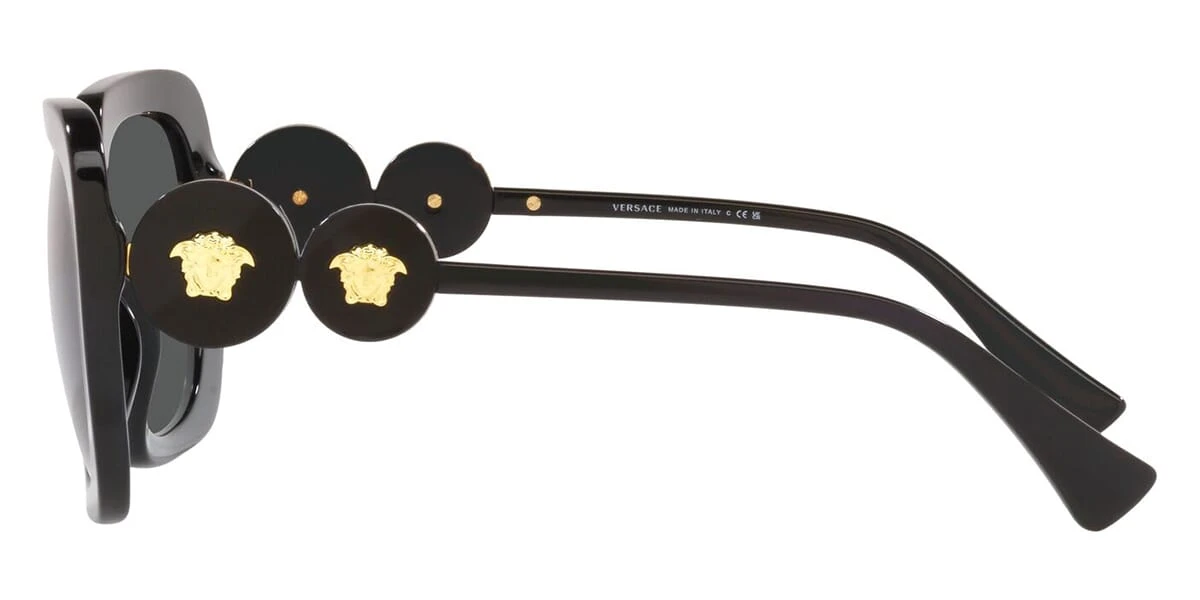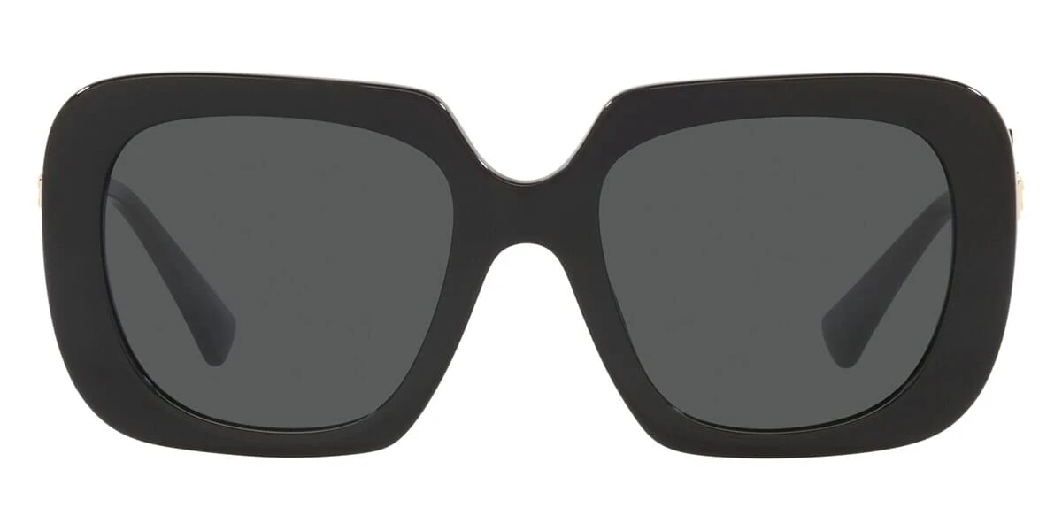 This square Versace sunglass comes in a black frame with dark grey lenses.