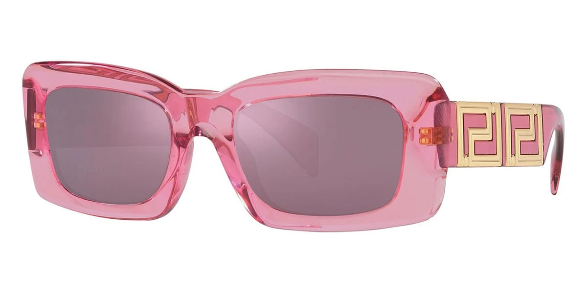 This rectangular Versace sunglass comes in a pink crystal frame with violet with silver internal mirror lenses.