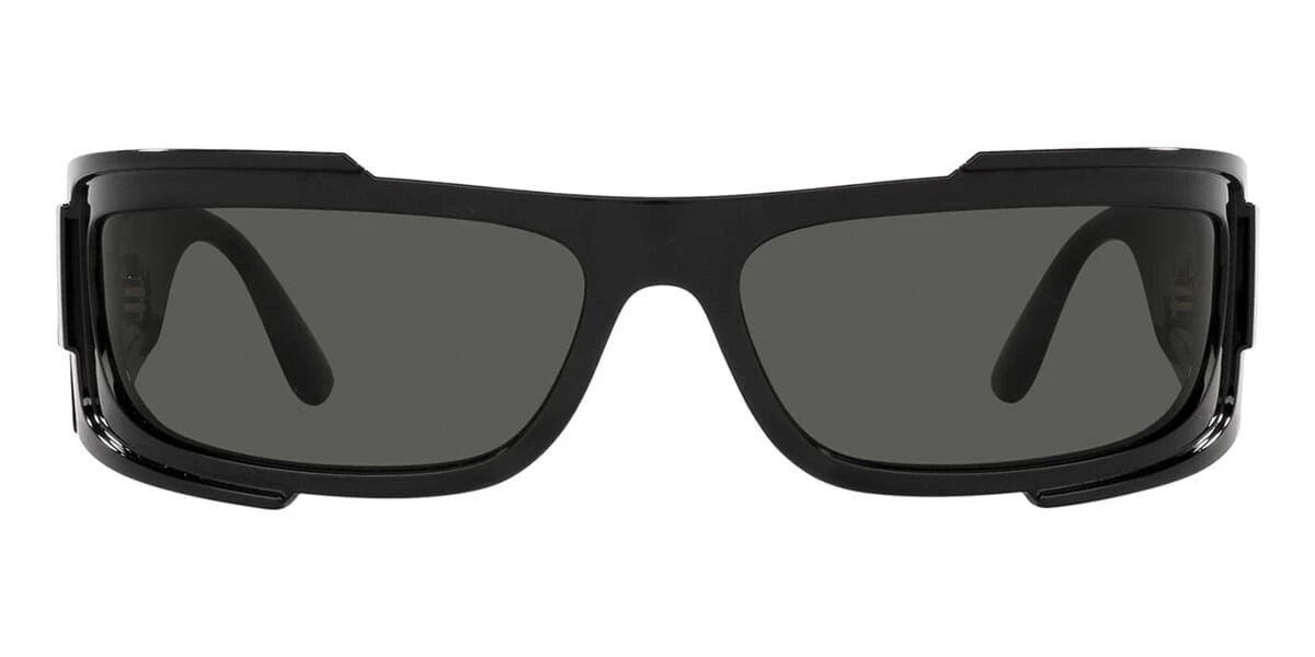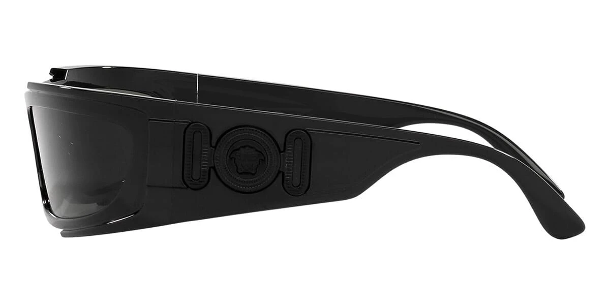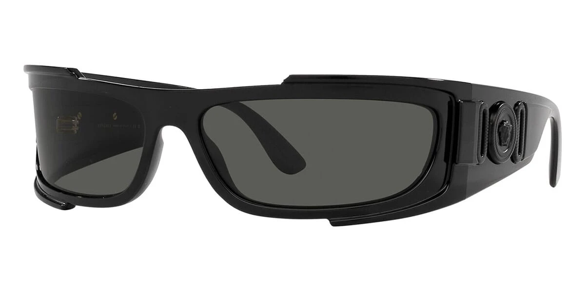 This wraparound Versace sunglass comes in a black frame with dark grey lenses.