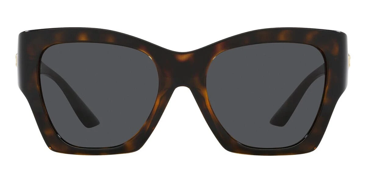 This cat eye Versace sunglass comes in a havana frame with dark grey lenses.