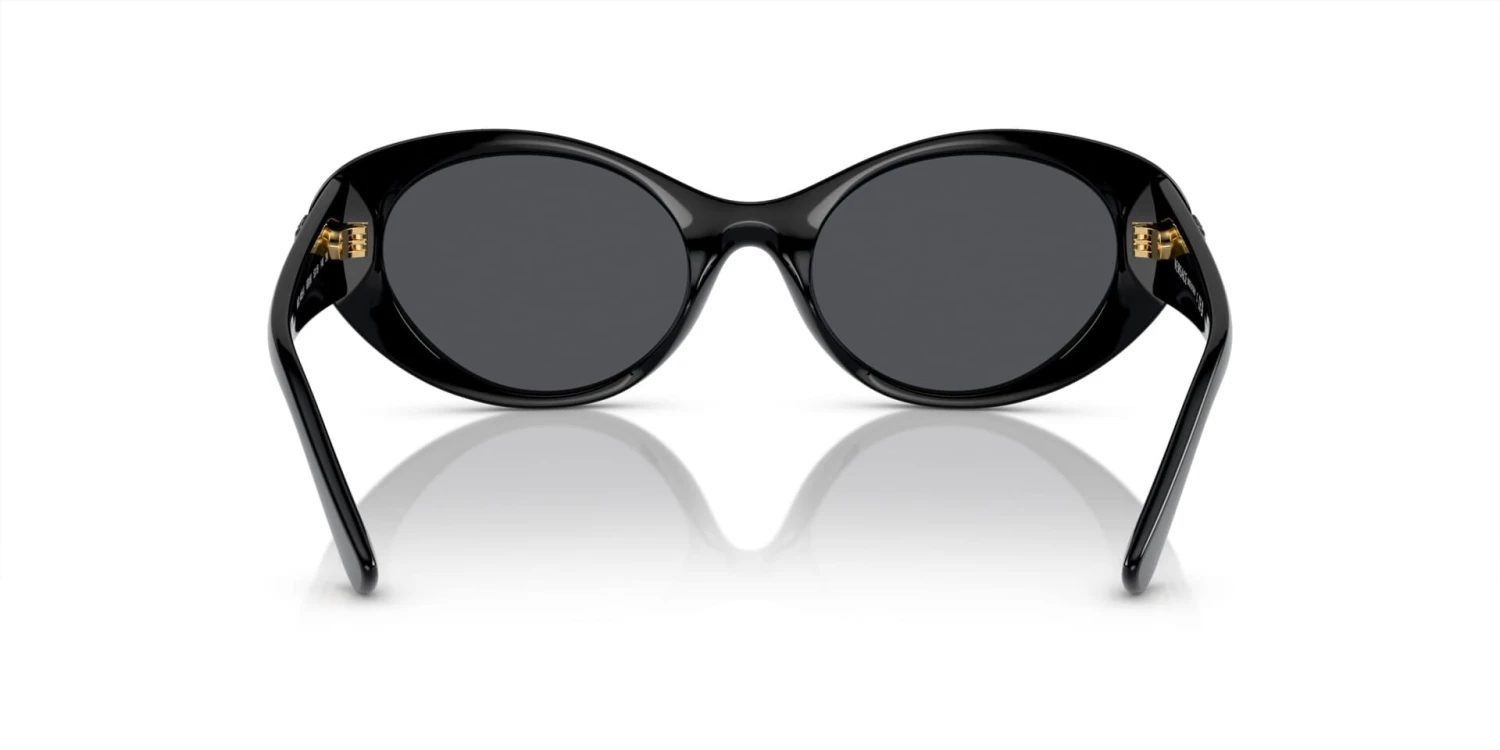 This round Versace sunglass comes in a black frame with dark grey lenses.