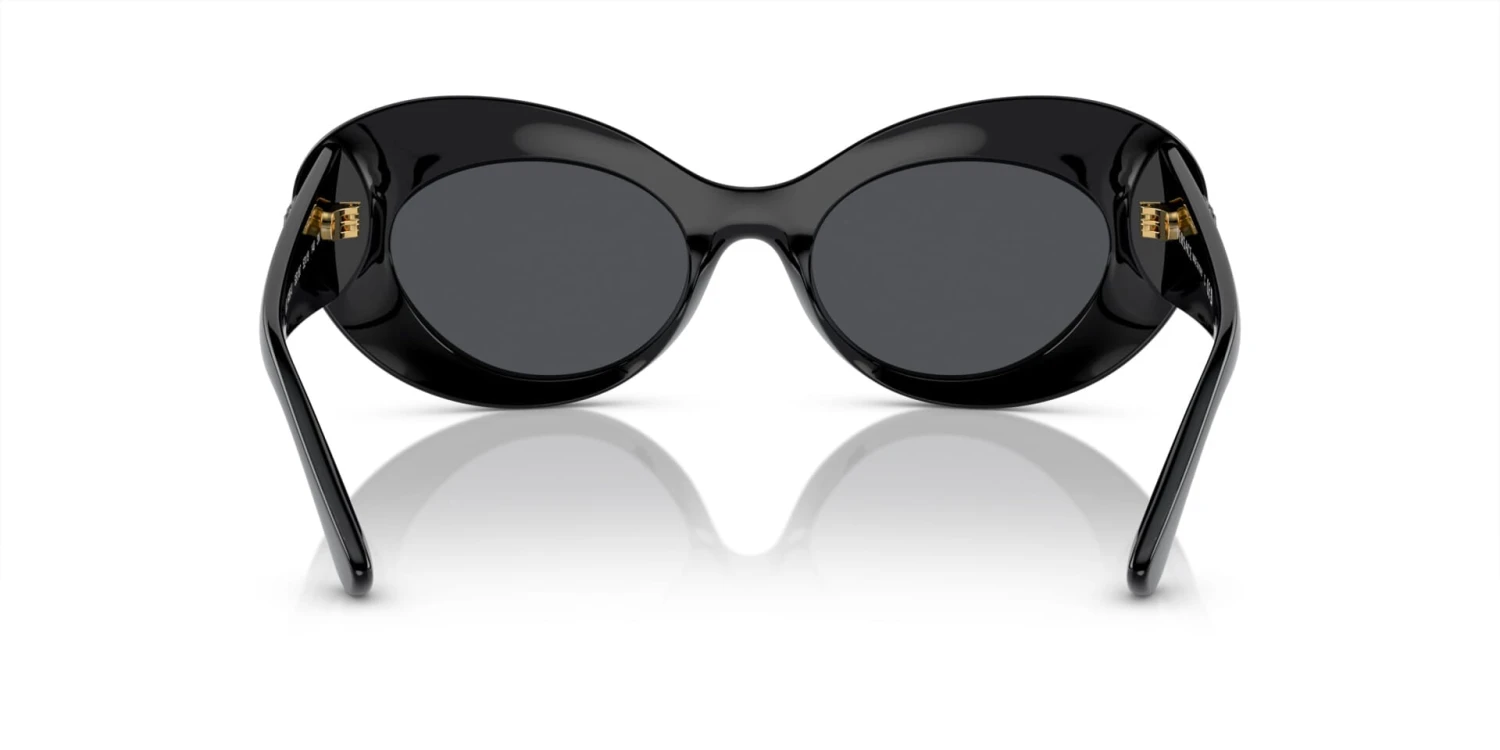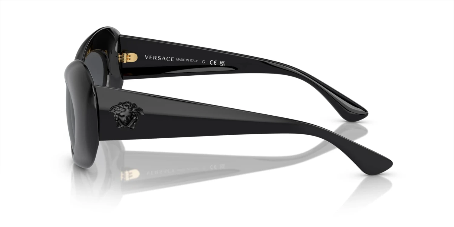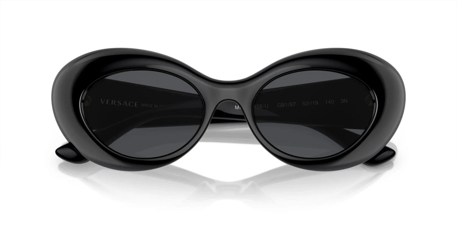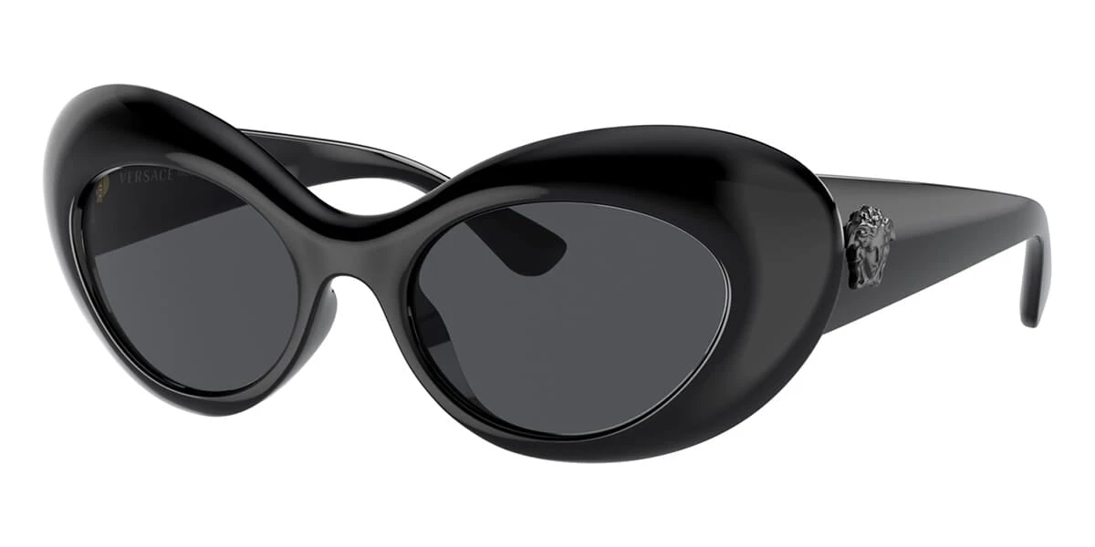 This round Versace sunglass comes in a black frame with dark grey lenses.