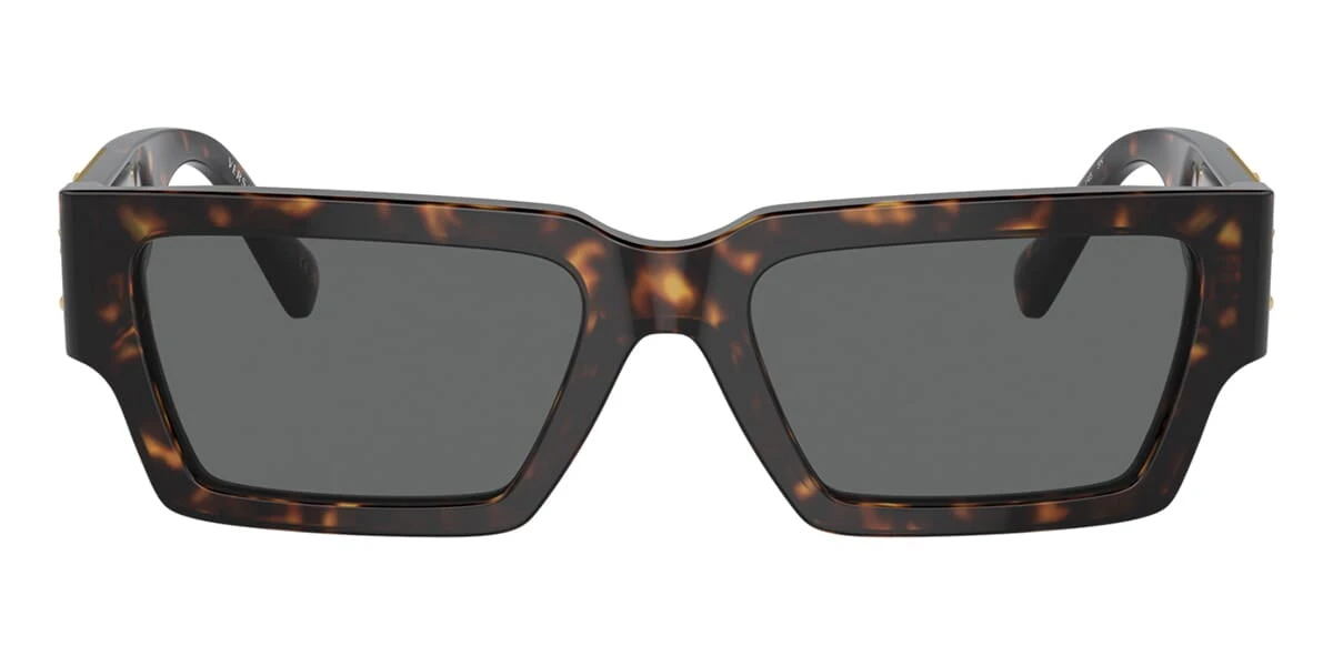 This rectangular Versace sunglass comes in a havana frame with dark grey lenses.