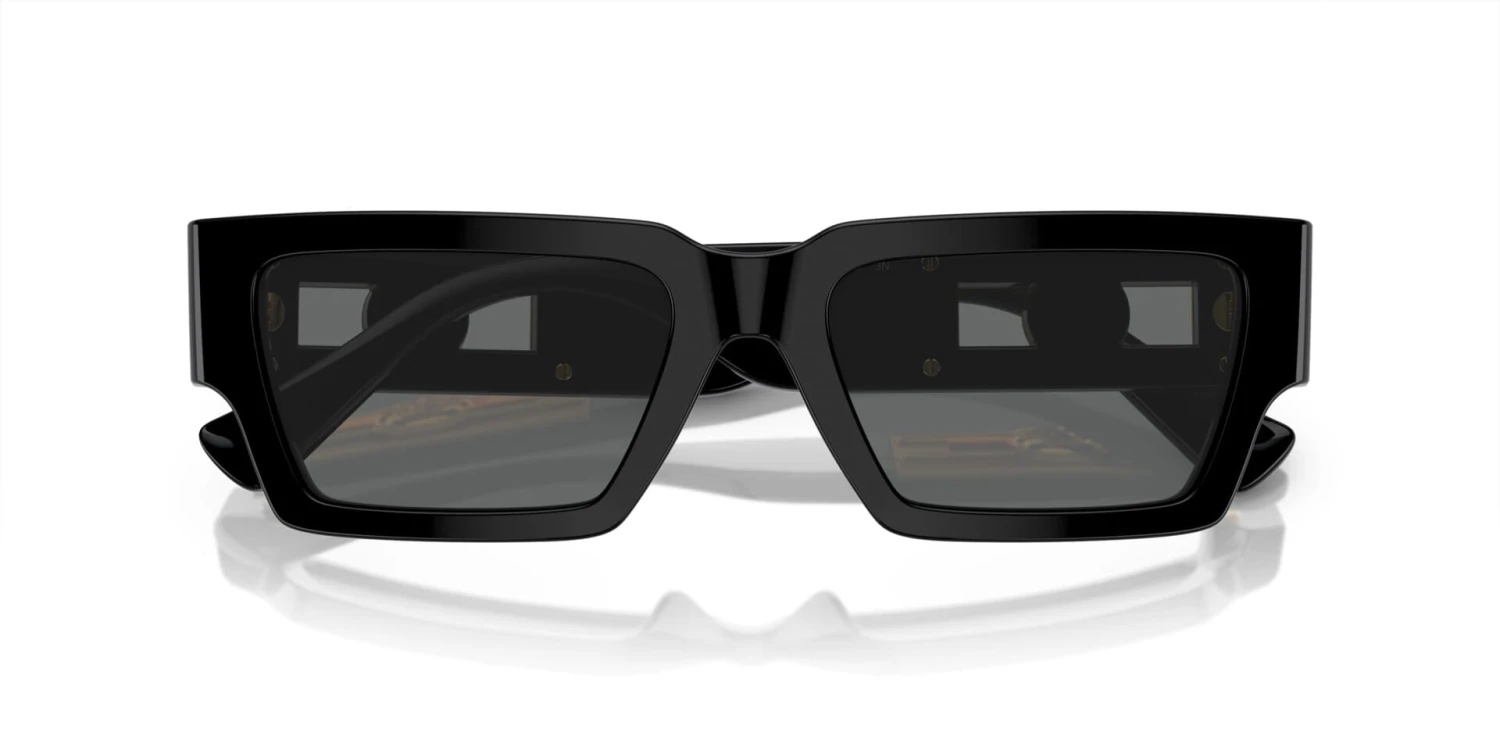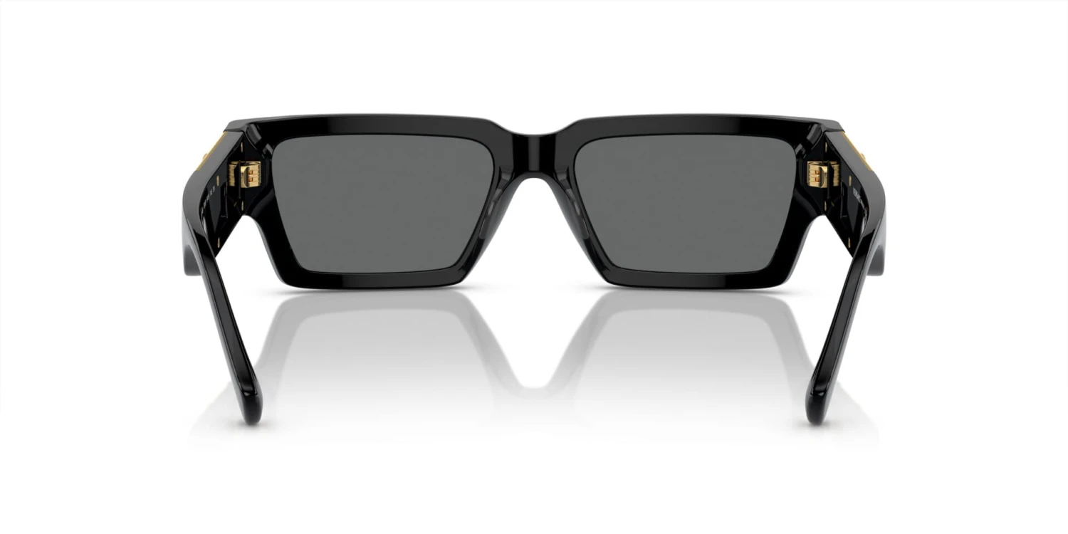 This rectangular Versace sunglass comes in a black frame with dark grey lenses.