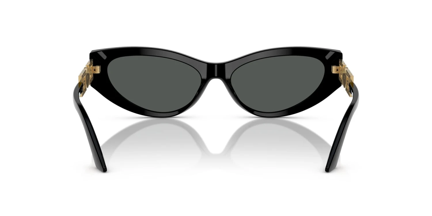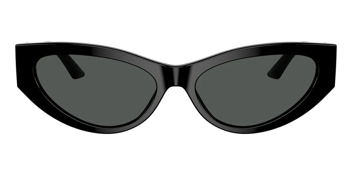 This cat eye Versace sunglass comes in a black frame with dark grey lenses.