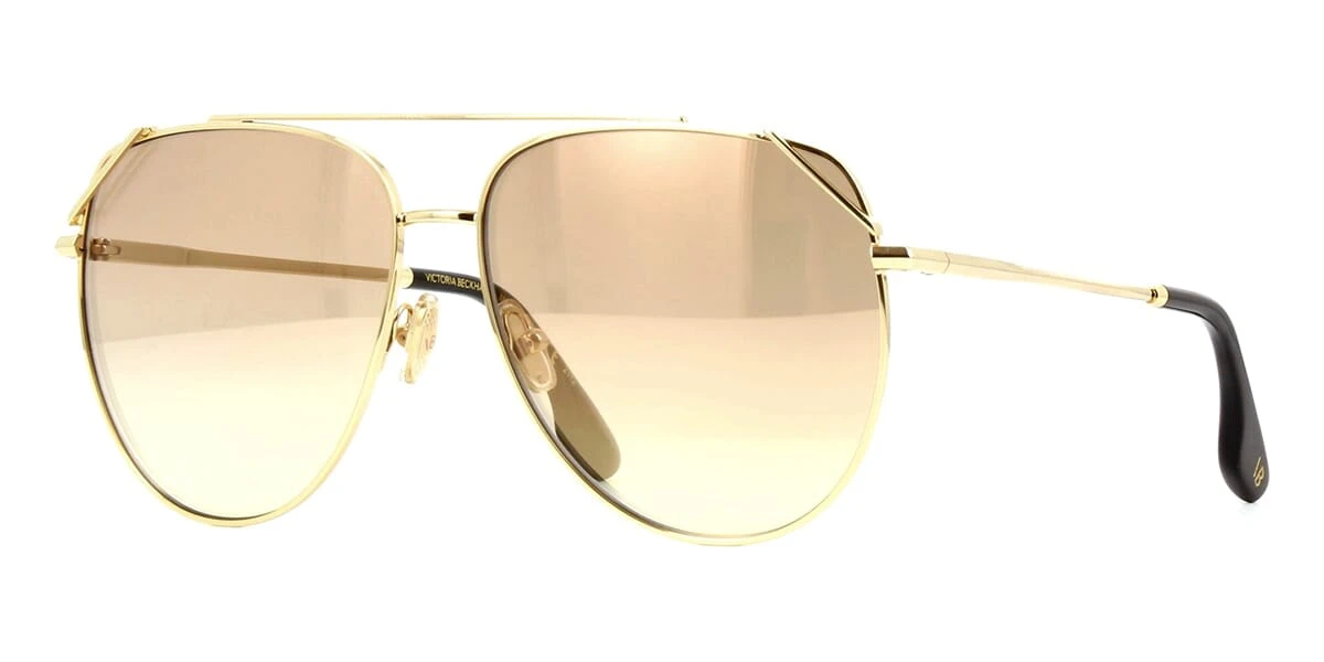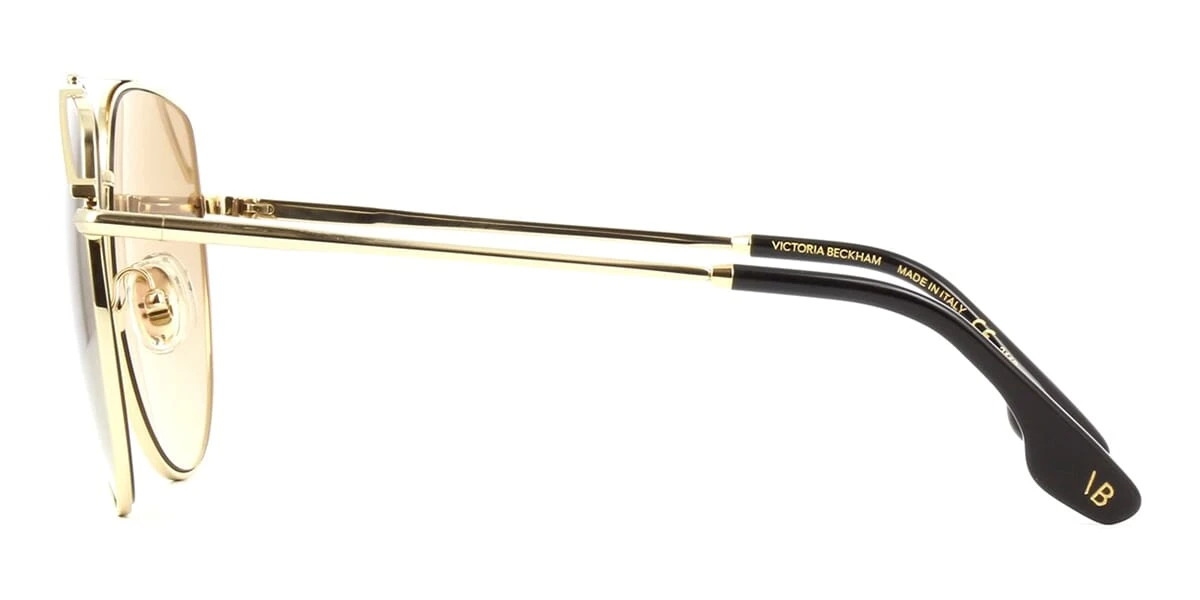 This aviator Victoria Beckham sunglass comes in a gold with black frame with orange lenses.