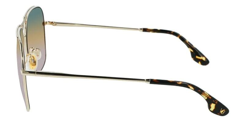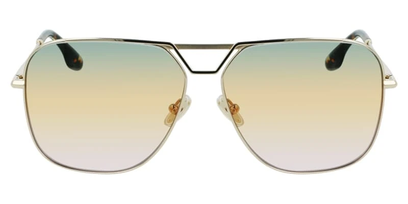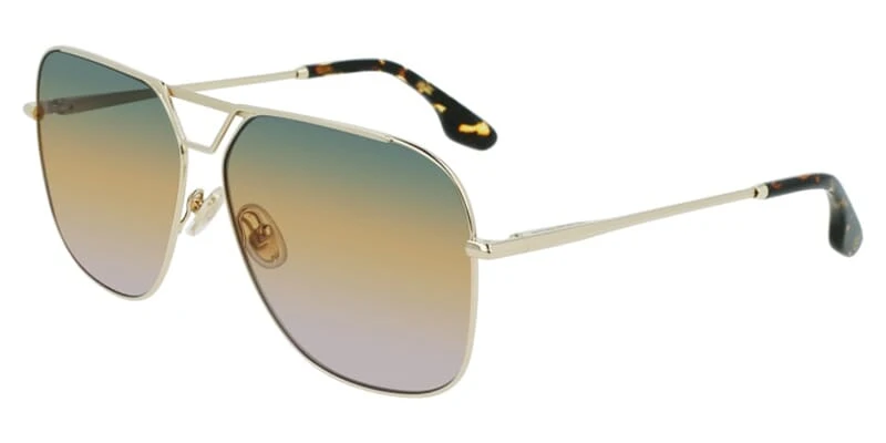 This square Victoria Beckham sunglass comes in a gold and brown frame with green to brown pink tri-gradient lenses.
