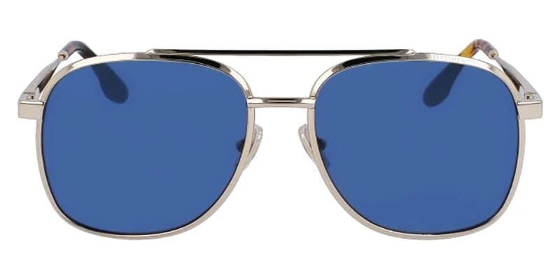 This square Victoria Beckham sunglass comes in a gold and havana frame with dark blue lenses.