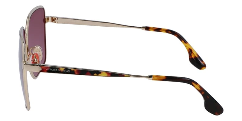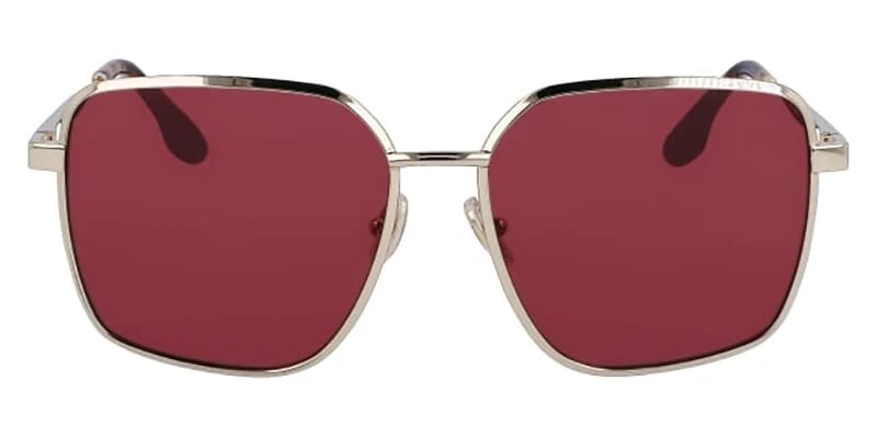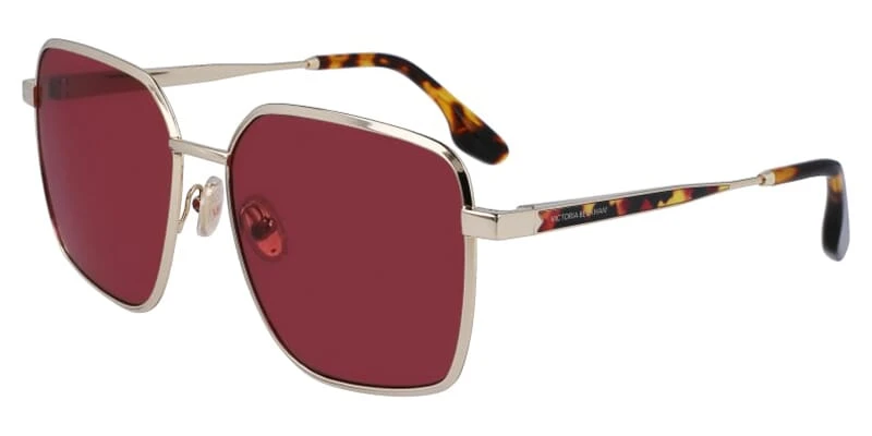 This square Victoria Beckham sunglass comes in a gold and havana frame with red lenses.