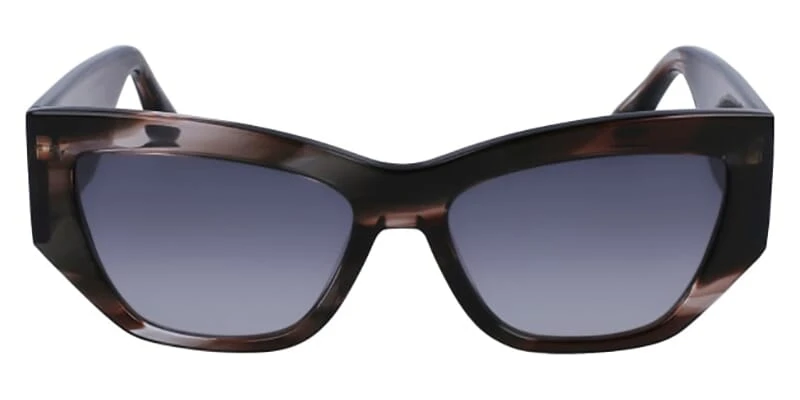This cat eye Victoria Beckham sunglass comes in a striped grey frame with grey gradient lenses.
