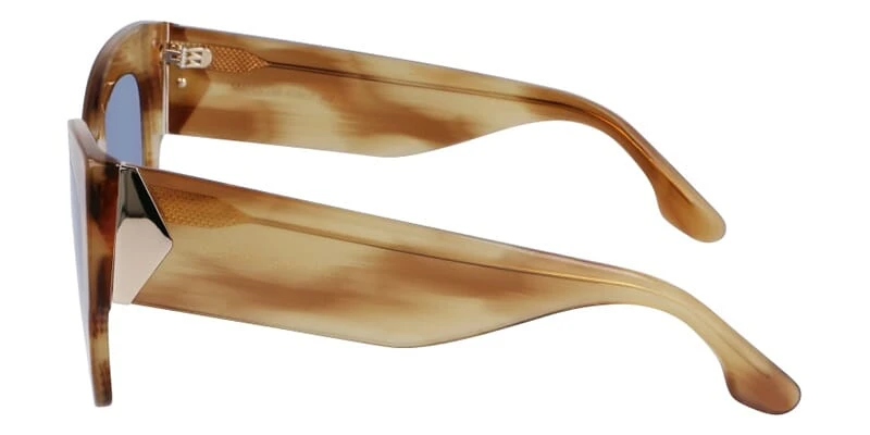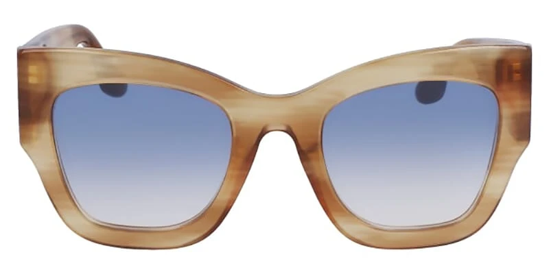 This cat eye Victoria Beckham sunglass comes in a honey brown horn frame with blue gradient lenses.