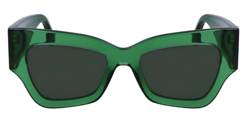 This square Victoria Beckham sunglass comes in a green with gold frame with grey lenses.