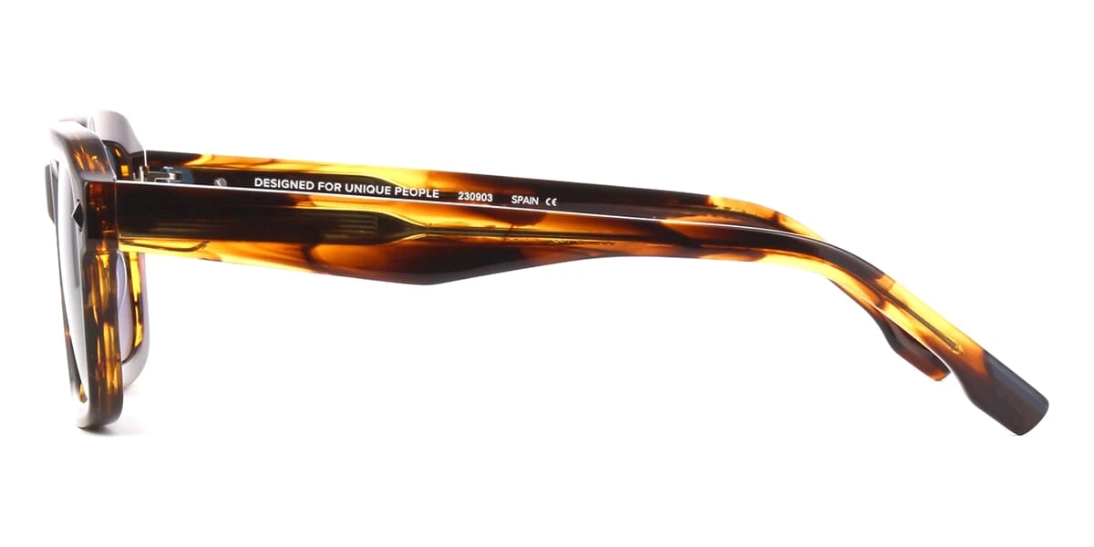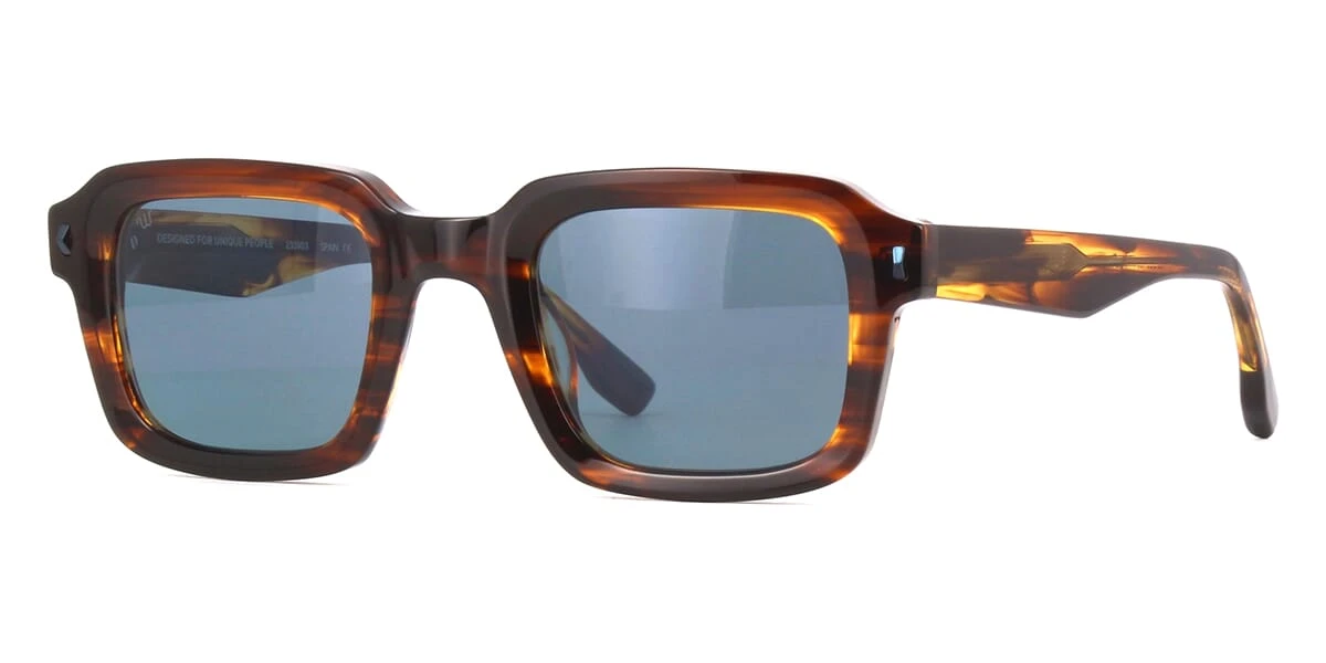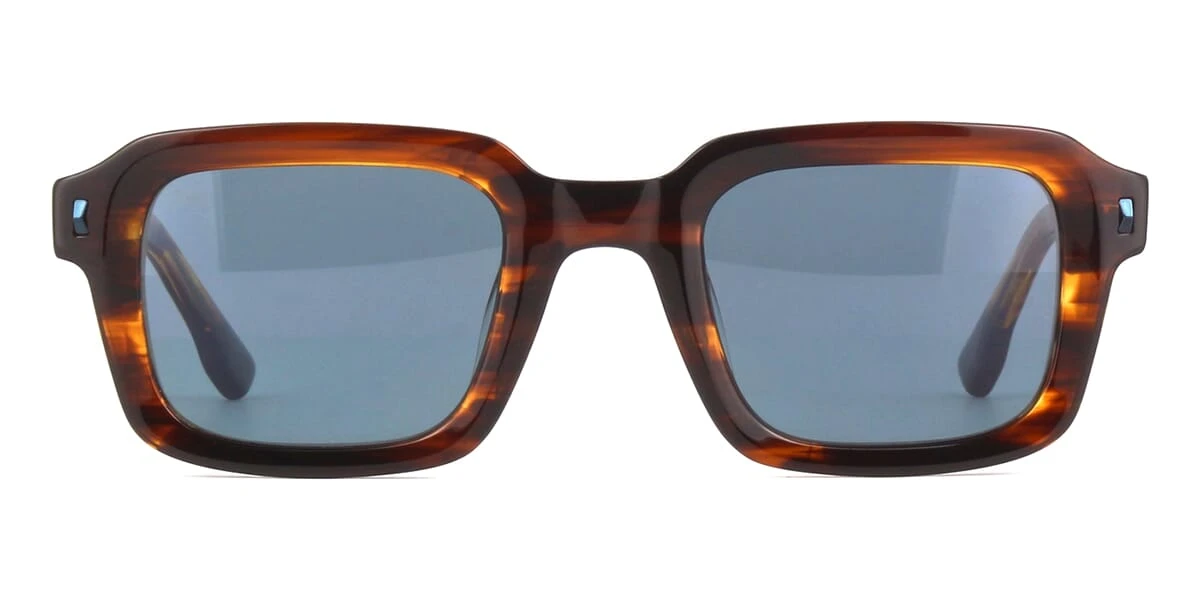 This square Woodys sunglass comes in a brown havana frame with blue lenses.