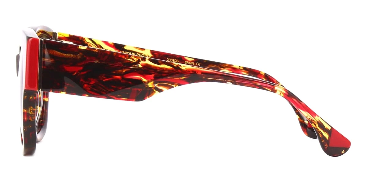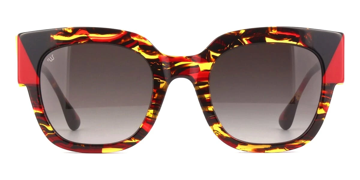 This square Woodys sunglass comes in a red and gold havana frame with grey gradient lenses.