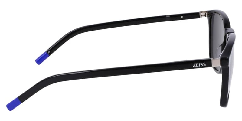 This round Zeiss sunglass comes in a shimmering black with royal blue frame with grey with light mirror lenses.